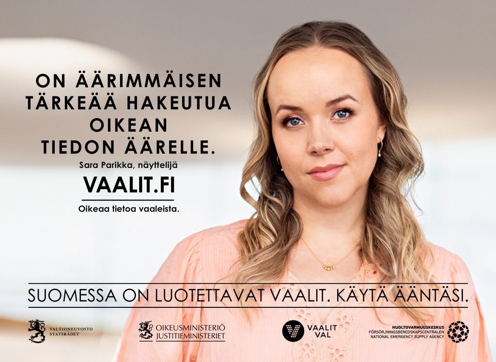 Oikeusministeriön, Huoltovarmuuskeskuksen ja valtioneuvoston kanslian yhteinen viestintäkampanja käynnistyy tänään teemalla: Suomessa on luotettavat vaalit – Käytä ääntäsi. Tarkoituksena on torjua mahdollista vaaleihin liittyvää disinformaatiota ja kannustaa käyttämään äänioikeuttaan. Muistutamme medialukutaidosta ja ohjaamme luotettavan viranomaistiedon äärelle.